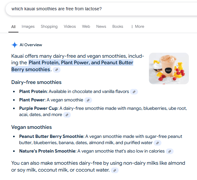 I was off lactose for a while (the things we do for our offspring!), and I wanted a smoothie from one of my favorite smoothie chains. So, of course, I Googled, and the AIO gave me the specific answer I wanted (and more) straight away: