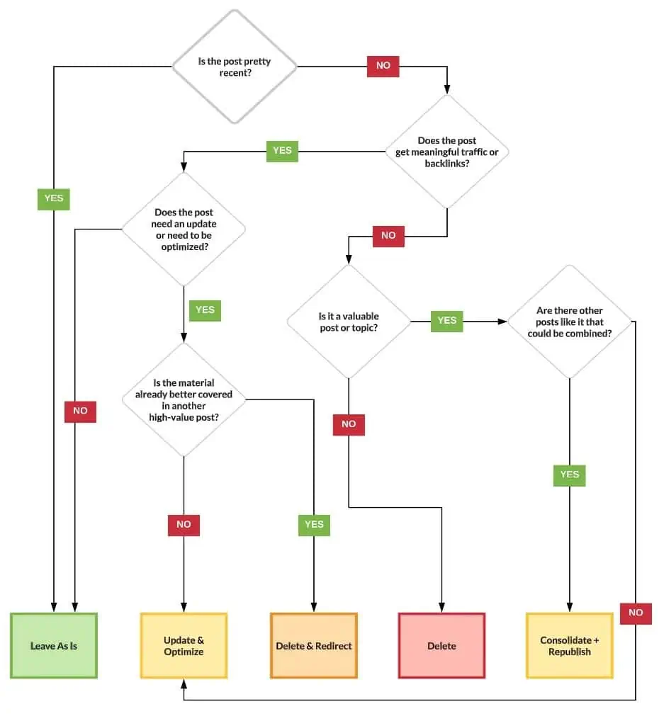 I like this nifty flowchart from the Blog Marketing Academy that helps you decide what to do with existing blog content: