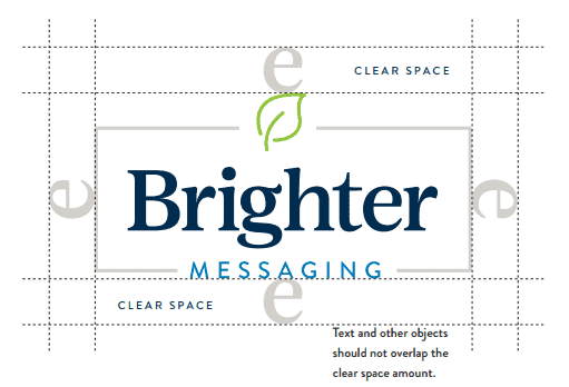 - Clear Space: The amount of space that must surround the logo to ensure it isn’t crowded by other elements. Here’s an example from Brighter Messaging’s style guide.