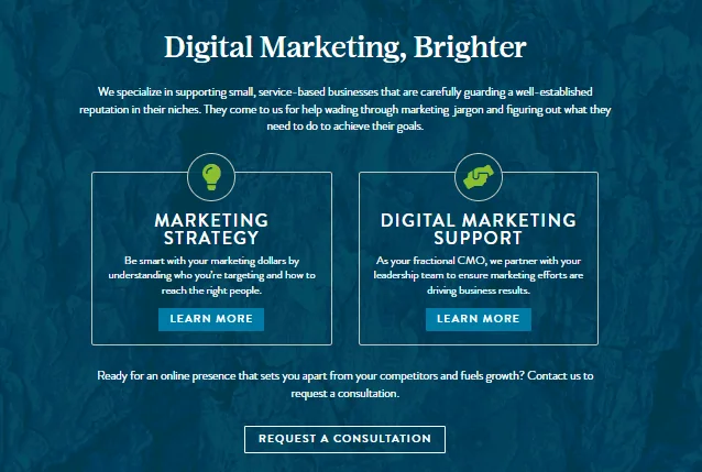 CTAs are your sales funnel’s best friend, helping your user transition between the phases of the buyer’s journey. Looking at the example from the Brighter Messaging website, users who visit the homepage might have done their research and know what they want immediately (they’re ready to ‘REQUEST A CONSULTATION’); others will need to ‘LEARN MORE’ about the different service offerings (Marketing Strategy or Digital Marketing Support).